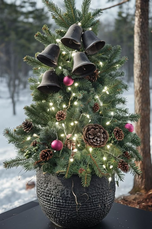 A black textured pot holds a compact pine tree trimmed with bronze bells, pinecones, and mini lights. This setup mixes natural elements with rustic charm, creating one of the most striking outdoor Christmas planters for snowy settings.