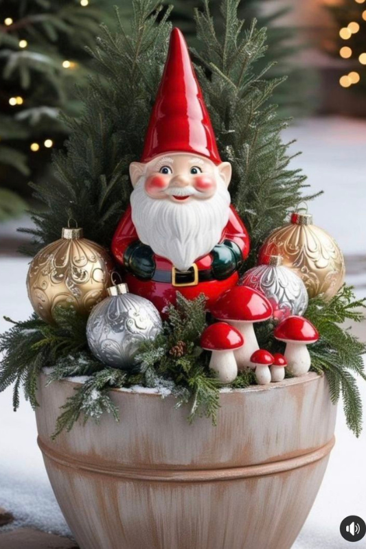 A cheerful garden gnome surrounded by lush evergreens, red toadstools, and oversized ornaments adds a playful twist to your Christmas planter setup. This design works well for front porch Christmas decorations that lean whimsical, especially when paired with metallic baubles and textured greenery