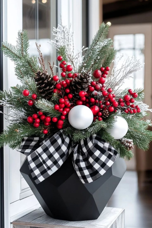 This striking arrangement mixes bold red berries, frosted pinecones, and evergreen sprigs in a faceted black planter. A black-and-white buffalo plaid bow adds contrast, perfect for modern Christmas planter ideas that balance farmhouse charm with sleek design.