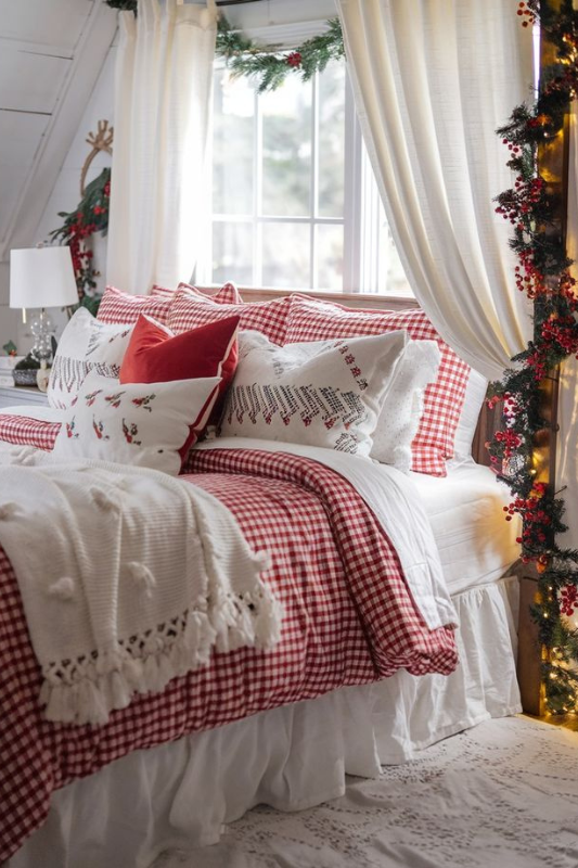 Red gingham bedding instantly sets a festive, cabin-style tone. Paired with crisp white layers, berry garlands on the window frame, and seasonal throw pillows, this bedroom feels joyful and inviting. Use gingham or plaid as your base, then add neutral textures like tassel throws or embroidered pillows for a balanced mix.
