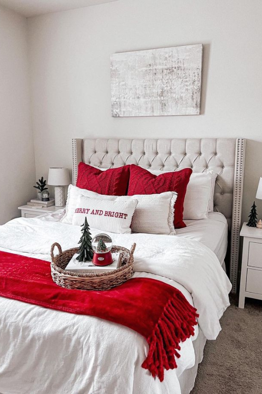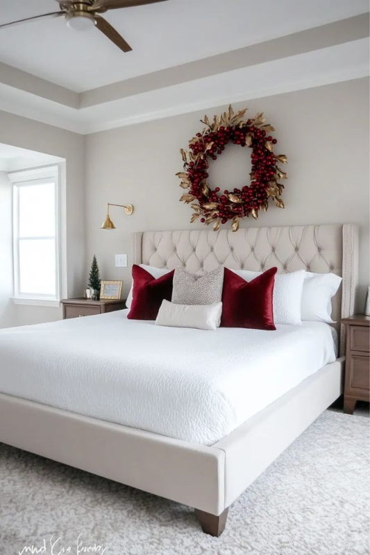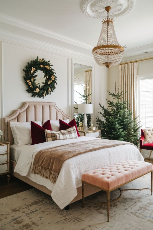 This look brings a touch of luxury to Christmas styling. A tufted headboard, rich burgundy velvet pillows, and a soft tan throw set the tone. Add a full greenery wreath with gold ornaments above the bed and place a real or faux tree in the corner for a festive anchor. Gold-framed mirrors and crystal chandeliers elevate the space without detracting from the holiday charm. Stick to a simple palette of red, gold, and green for a refined yet cozy feel.
