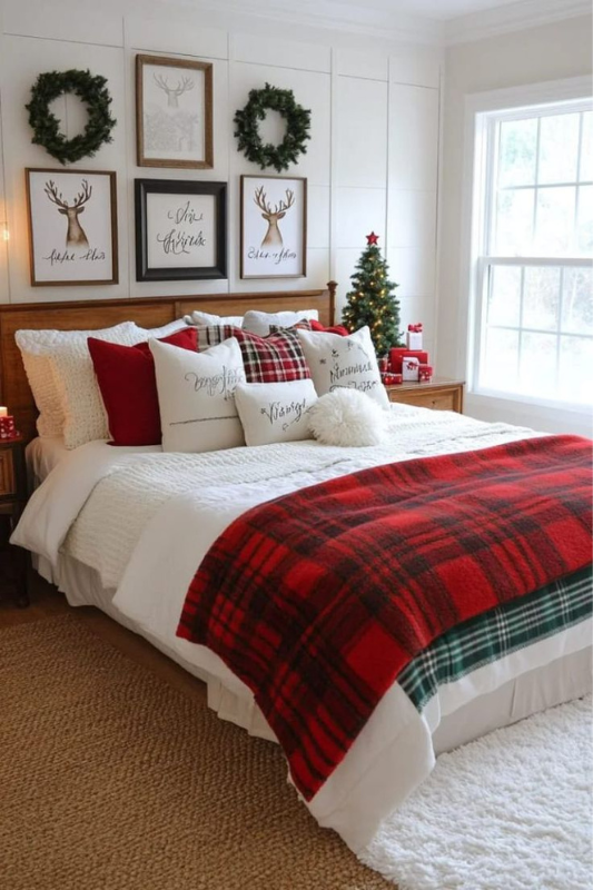 This bedroom feels like a holiday card come to life. A red plaid blanket layered over green tartan sheets makes the bed the focal point. Add seasonal wall art, small wreaths, and a mini tree on the nightstand for full Christmas coverage. Mixing script art with reindeer prints gives it a curated, lived-in charm. Tuck wrapped presents under the window or bed for a decorative and practical touch.