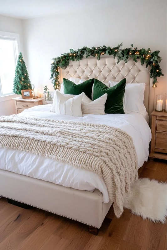 This look proves you can go festive without using red. A snowy white base pairs beautifully with deep green velvet pillows and a chunky knit blanket. A simple garland draped over the headboard, plus a mini lit tree on the nightstand, creates an understated but festive vibe. It’s clean, calm, and ideal for fans of minimal or Scandi-style decor.