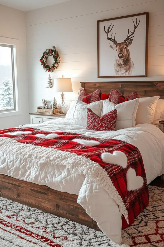 This setup blends modern rustic with playful warmth. A red-and-white plaid throw adds bold pattern, while knit pillows and soft layers keep things extra snuggly. Wall art featuring a reindeer brings in a wintery woodland feel, and a mini wreath above the nightstand pulls it all together. Use natural wood tones, cozy textures, and classic red hues to create a festive farmhouse-inspired retreat.