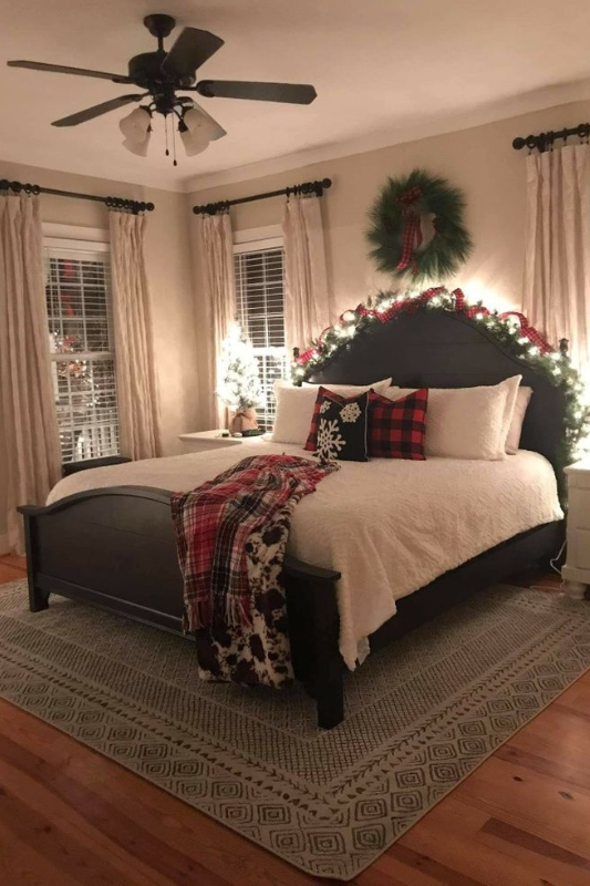 Soft lighting can completely change the bedroom’s mood. In this setup, a glowing garland curves over a dark headboard, creating a warm and inviting atmosphere in the space. A simple green wreath anchors the center wall, while buffalo check and snowflake pillows add festive contrast. A mini lit tree on the nightstand rounds out the look. Layer plaid throws with faux fur for added texture, and stick to warm white lights for a cozy, understated glow.