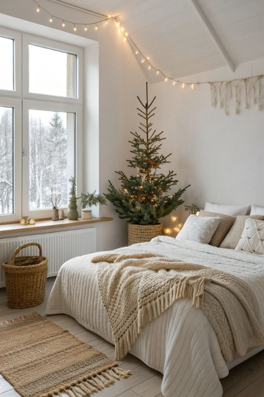 This setup is clean and calm, letting texture and light do the talking. A bare pine tree in a woven basket feels perfectly minimalist alongside layered cream bedding and a single string of fairy lights. It’s ideal for small bedrooms or those going for a natural, organic Christmas vibe.