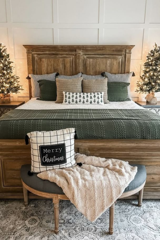 If you prefer a darker, moodier look, this bedroom uses deep green bedding, textured pillows, and warm wood tones. The symmetry of two small lit trees on either side creates balance and highlights the rustic feel of the headboard. Add a seasonal throw pillow (like “Merry Christmas”) to pull the whole theme together without overwhelming the palette.