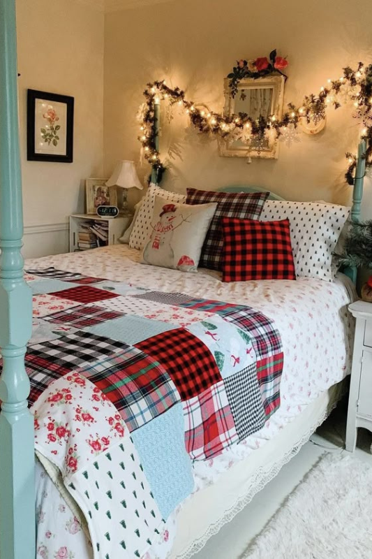 Pattern lovers, this one’s for you. A festive patchwork quilt becomes the centerpiece here, mixing checks, florals, and snowflake prints. Garlands with soft white lights frame the bed, creating a nostalgic, storybook charm. Mix old and new—use heirloom-style quilts or handmade items with fresh pillows to get that cozy cottagecore effect.