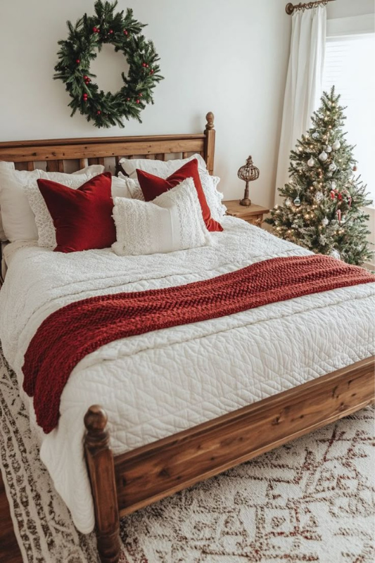 This look combines a simple wood bed frame with festive, no-fuss layering. A rich red knit runner and matching pillows pop beautifully against a soft, neutral quilt. A large greenery wreath over the bed keeps the wall visually grounded, while a traditional tree in the corner finishes the look. The mix of natural wood, greenery, and pops of red brings a clean, classic farmhouse feel that feels effortless.