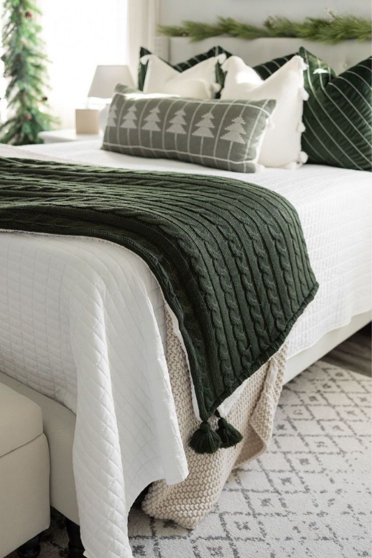 For a moodier, earth-toned look, this room uses deep forest green cable-knit throws and tree-print pillows to nod to the season without leaning on red. A touch of greenery above the headboard and a knit layer underneath keep it warm and textural. Great for those who want a modern, subtle take on Christmas using neutral and green tones.