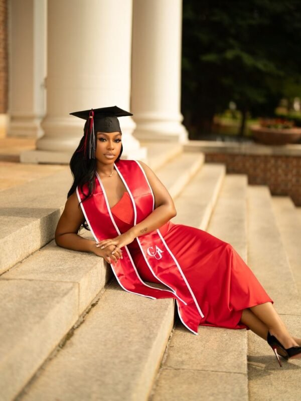 This graduation photo idea captures confidence and achievement timelessly. Sitting on stone steps in a cap and gown with a bold graduation stole creates a powerful visual that works perfectly for classic graduation photos, college graduation portraits, and professional graduation photoshoots. For best results, shoot during golden hour, keep posture relaxed, and let the architecture frame your success story.