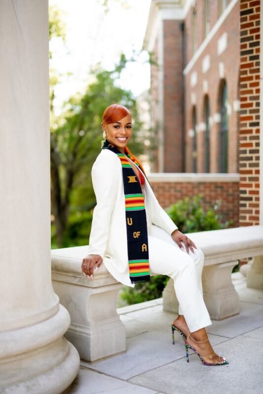 This graduation photo idea blends cultural pride with modern elegance. Wearing a tailored suit with a graduation stole creates bold, empowering graduation portraits that stand out. Sit or lean naturally against architectural elements for balance and confidence. This style works beautifully for graduation photo ideas for women, cap and gown alternatives, and statement graduation photoshoots.
