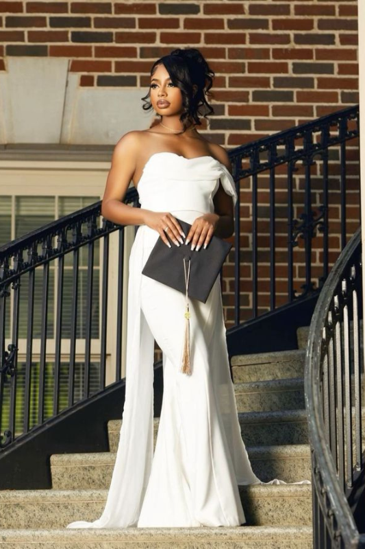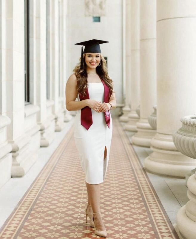 A refined graduation photoshoot idea featuring a minimalist white dress paired with a graduation cap and stole. This look blends elegance and confidence, ideal for modern female graduation photos and stylish graduation outfit inspiration.