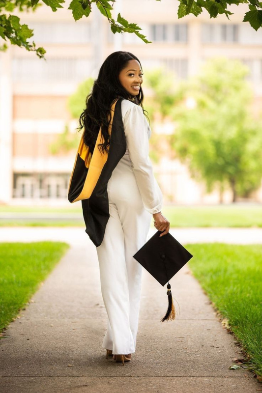 Looking back over your shoulder while holding your graduation cap combines confidence with softness, making this one of the most flattering graduation photo poses. This graduation photo idea naturally highlights facial features while keeping the body relaxed and angled. It works beautifully for campus walkways and green spaces and is perfect for graduates who want friendly, timeless graduation portraits.