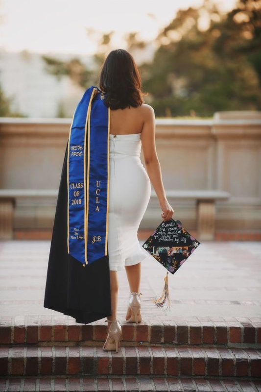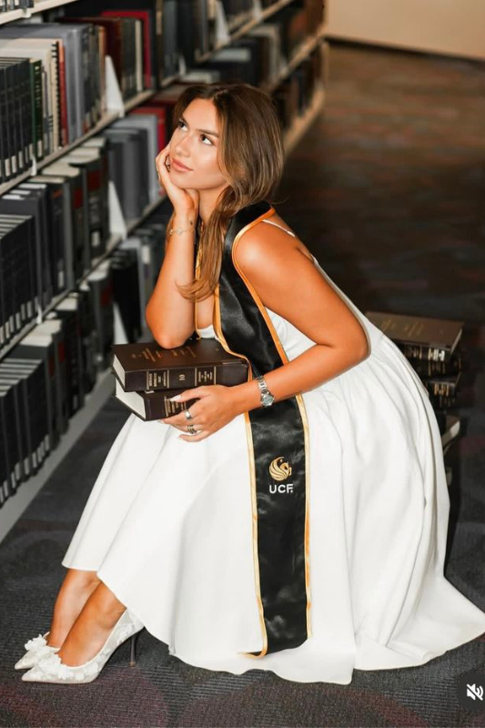 Turning your back slightly to the camera while holding your graduation cap creates a graduation photo that feels reflective and story driven. This pose highlights your outfit silhouette and academic stole while giving the photo a calm, intentional mood. This graduation photo idea works best at golden hour and is perfect for graduates who want graduation photos that feel meaningful rather than performative.