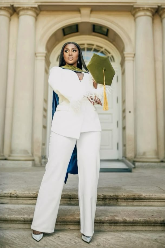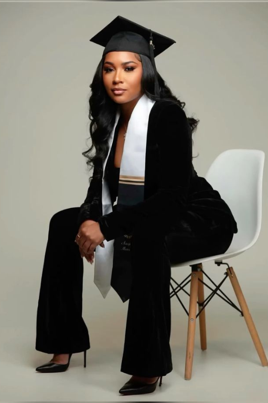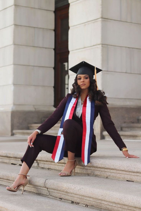 A stylish graduation photoshoot featuring a fitted dress, graduation stole, and medal for an elevated look. Ideal for graduates looking for chic graduation dress photoshoot ideas that highlight achievement and confidence.