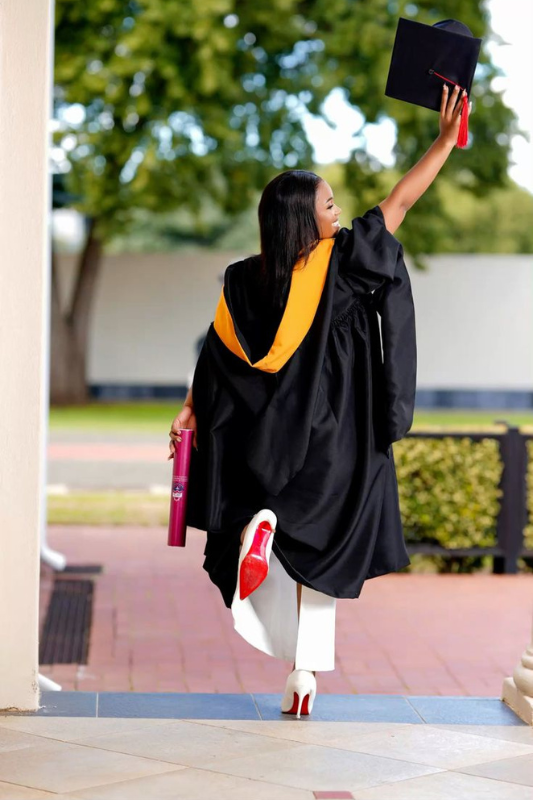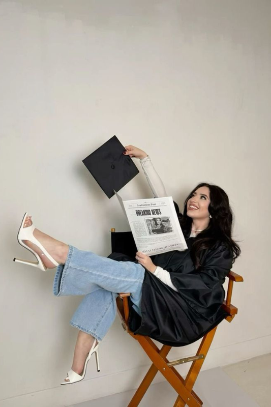 This graduation photo pose works because it breaks traditional rules. Sitting casually with crossed legs and relaxed posture creates a fashion-forward graduation photo that feels modern and effortless. It is perfect for studio shoots or minimalist settings and works well for graduates who want personality and comfort to show through their photos.