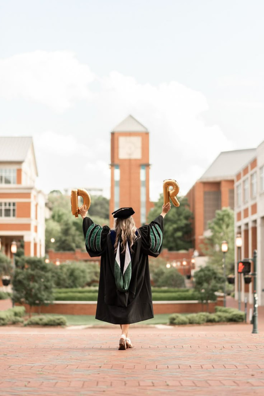 This graduation photo idea captures motion, freedom, and the feeling of leaving one chapter behind. Walking away from the camera with your gown draped over one shoulder creates a cinematic, editorial-style graduation photo that feels effortless and emotional.