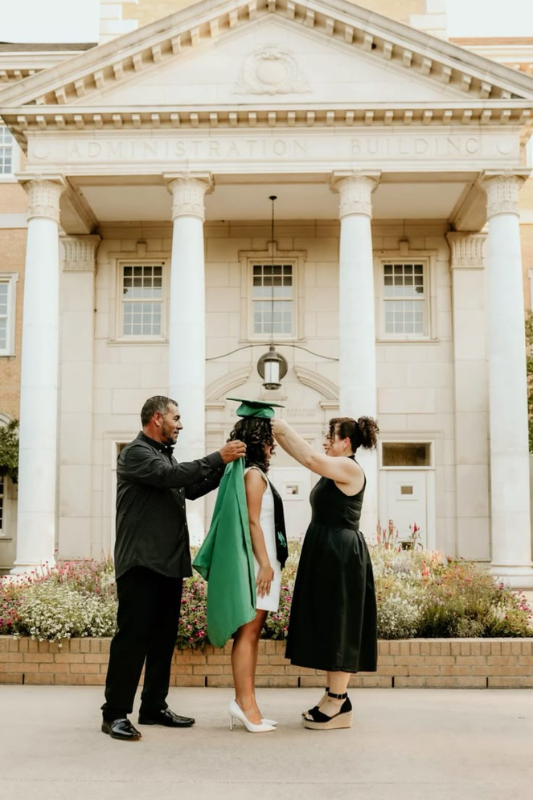 This graduation photo idea focuses on genuine interaction rather than posing. Letting family members adjust your gown or cap captures emotion, connection, and meaning that posed shots cannot replicate. These candid graduation photos are often the most cherished because they document the support system behind the achievement and add depth to your graduation photoshoot.