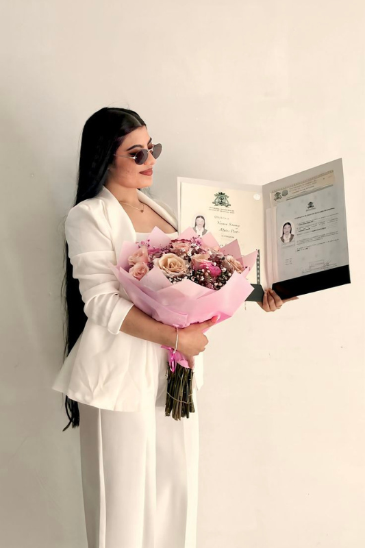 This graduation photo idea focuses on achievement and proof. Holding your diploma folder while carrying flowers instantly tells the story of completion and success. This pose works best against a clean wall or simple background to keep attention on the diploma, making it ideal for graduation photos that celebrate the academic milestone clearly and confidently.