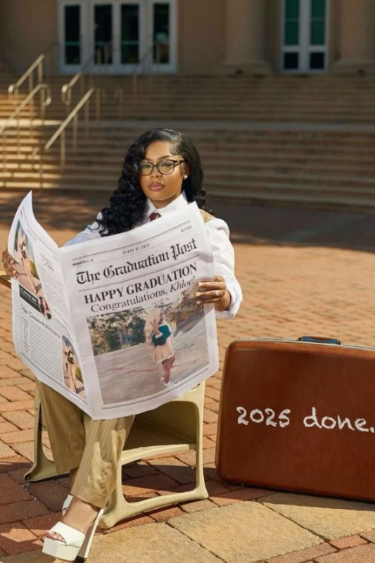 This graduation photo pose feels cinematic and reflective. Sitting calmly while holding a newspaper or symbolic prop creates a storytelling moment that marks closure and transition. This graduation photo idea works well in open campus spaces and is ideal for graduates who want creative, editorial-style graduation photos that feel intentional and unforgettable.