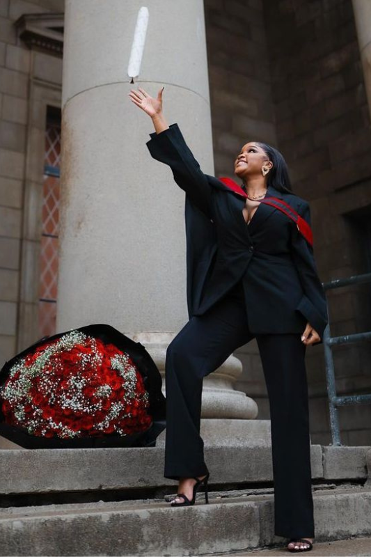 This graduation photo pose stands out because it blends fashion with achievement. Wearing a tailored suit and holding the graduation cap confidently signals authority and accomplishment. Standing tall with shoulders back and feet slightly apart creates a strong silhouette that photographs beautifully. This graduation photo idea is perfect for graduates who want modern, confident graduation portraits that feel editorial and forward-looking.