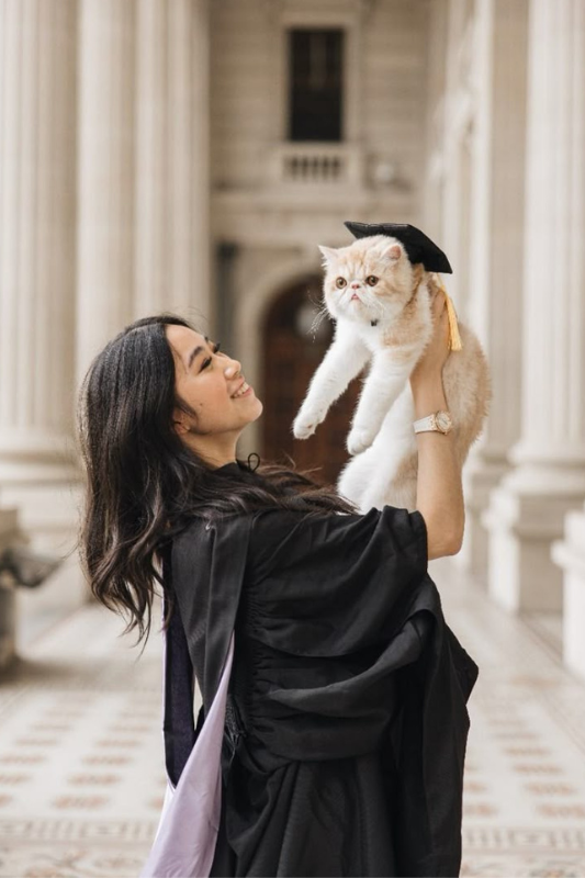 This graduation photo pose adds warmth and originality by including a meaningful companion. Holding a pet while wearing your graduation gown creates an emotional, joyful image that feels authentic and memorable. This graduation photo idea works best in calm, familiar spaces and is ideal for graduates who want playful yet heartfelt graduation photos.