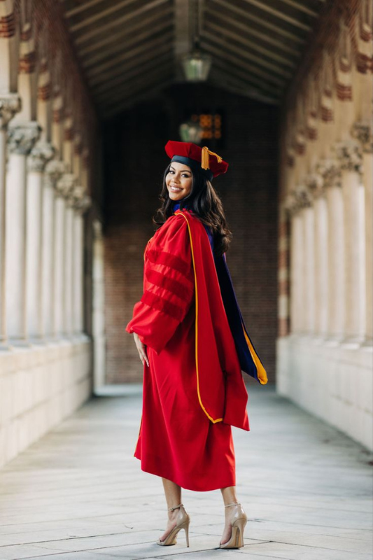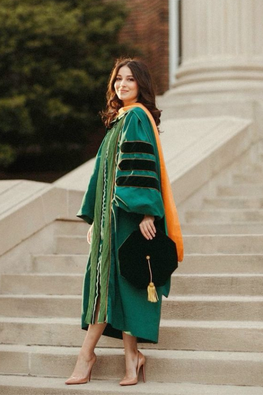 This graduation photo idea is powerful because it highlights academic achievement through posture and movement. Turning slightly while looking back over the shoulder creates depth and authority without stiffness. The flowing doctoral gown adds motion, making the graduation photo feel ceremonial and editorial at the same time. This pose works best in architectural spaces like hallways or archways and is ideal for PhD or doctoral graduation portraits.