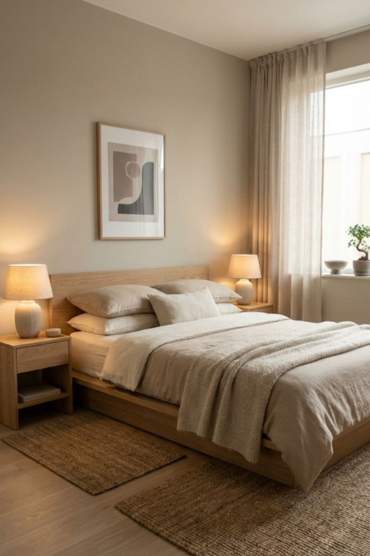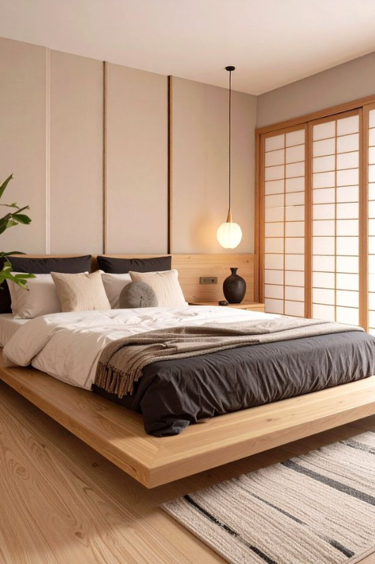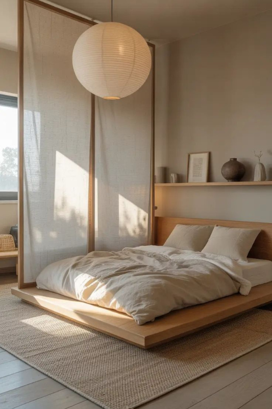 Japandi bedrooms favor intention over excess. Furniture pieces are few, but purposeful. Instead of filling every corner, focus on what you truly need. A well-chosen bed, simple nightstands, and minimal decor allow the room to breathe and make the space feel restful rather than crowded.