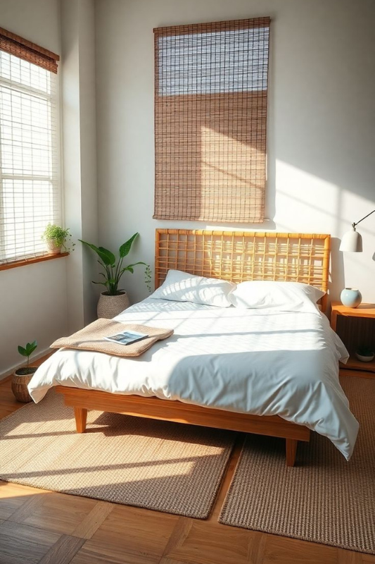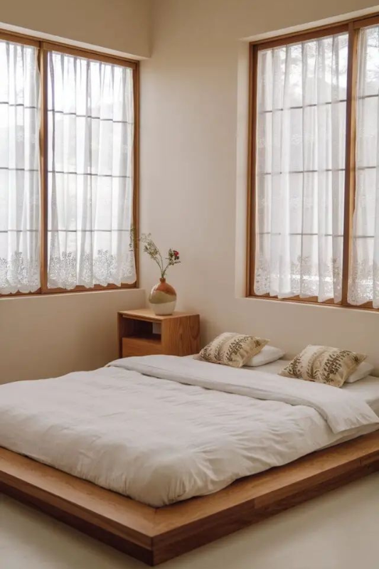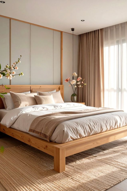 Natural light adds warmth and softness to Japandi interiors. Sheer curtains, light window treatments, or uncovered windows help sunlight filter in gently. The goal is not brightness, but warmth. When natural light becomes part of the design, the bedroom feels more open and calming throughout the day.