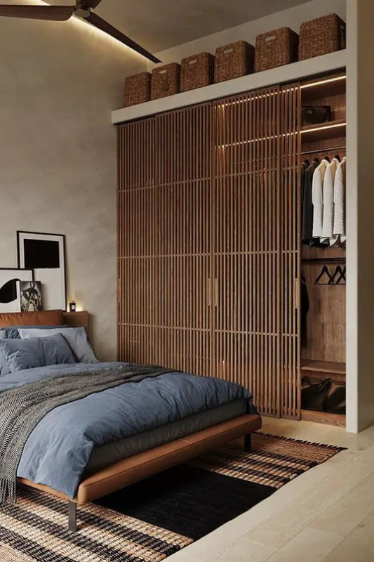 Low-profile beds are a signature element of Japandi design. They keep the room feeling grounded and visually open, while reinforcing the connection to Japanese interiors. Paired with soft bedding and natural materials, a low wooden bed creates a peaceful focal point without overpowering the space.