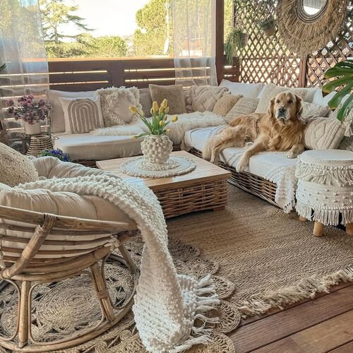 This look uses warm wood tones, woven textures, soft cushions, layered rugs, and plenty of greenery.