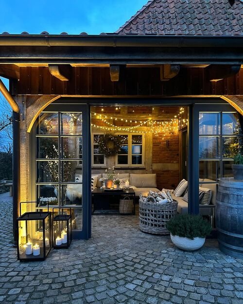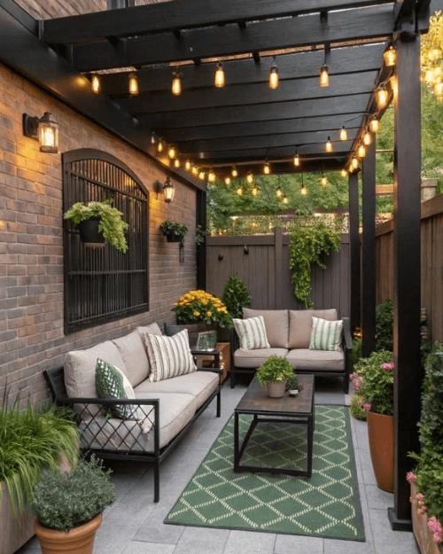 Add comfortable seating, an outdoor rug, cushions, soft lighting, and a few plants. Cozy patios usually feel layered, warm, and easy to relax in.