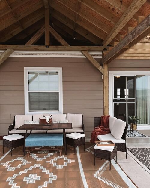 They help define a seating area, make furniture feel anchored, and add softness underfoot. On a plain concrete patio or wood deck, a rug can instantly make the space feel more styled.