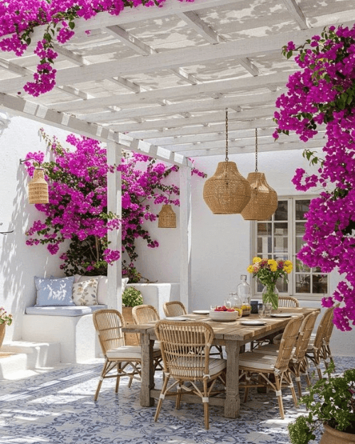 Boho outdoor decor often includes patterned textiles, lanterns, low seating, mixed textures, and a collected, casual look.