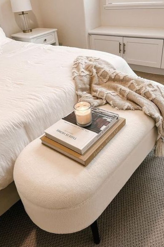 A storage bench placed at the foot of the bed is both practical and visually balanced. It creates a natural place to sit while getting dressed and provides hidden storage for blankets, pillows, or clothing overflow. In small rooms, furniture needs to earn its place, and a bench that combines seating with storage does exactly that without adding bulk.