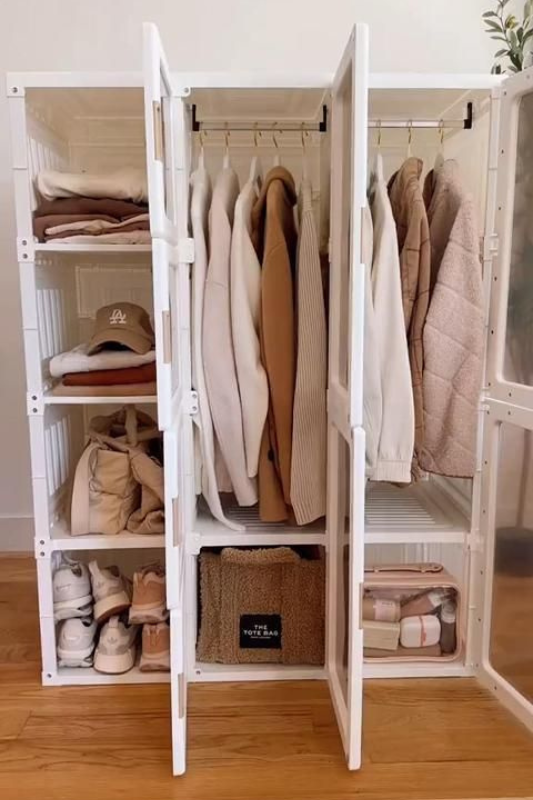 Open clothing storage can work in small rooms when styled thoughtfully. Limiting the number of items on display and sticking to a cohesive color palette helps avoid a cluttered look. This option works best for curated wardrobes and adds a boutique-like feel to the room.