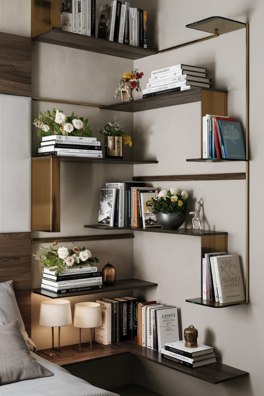 If your room layout allows for it, recessed shelves or wall niches provide storage without protruding into the room. They are ideal for displaying small items or storing essentials while keeping surfaces flush and uncluttered. This is a subtle way to add storage while maintaining a clean, streamlined look.