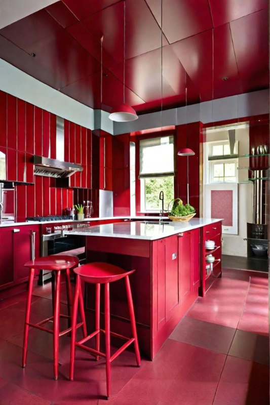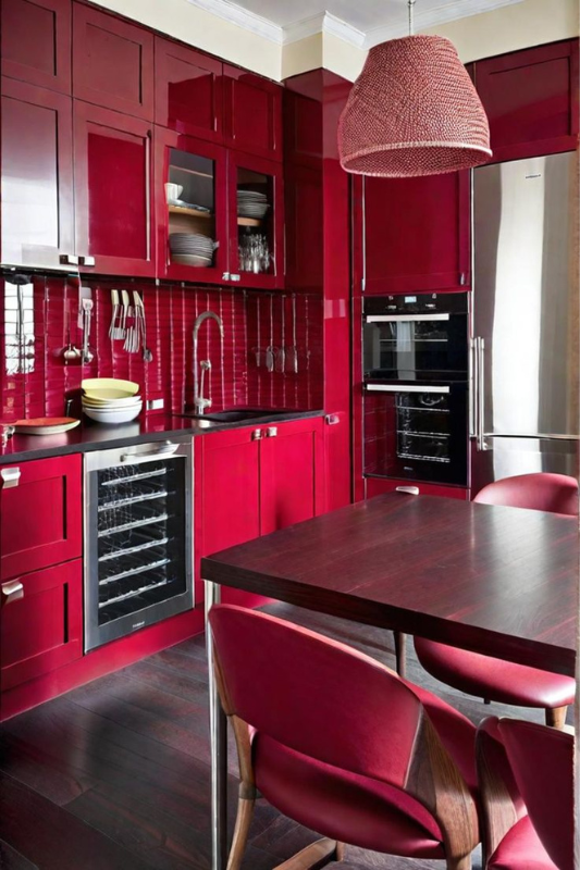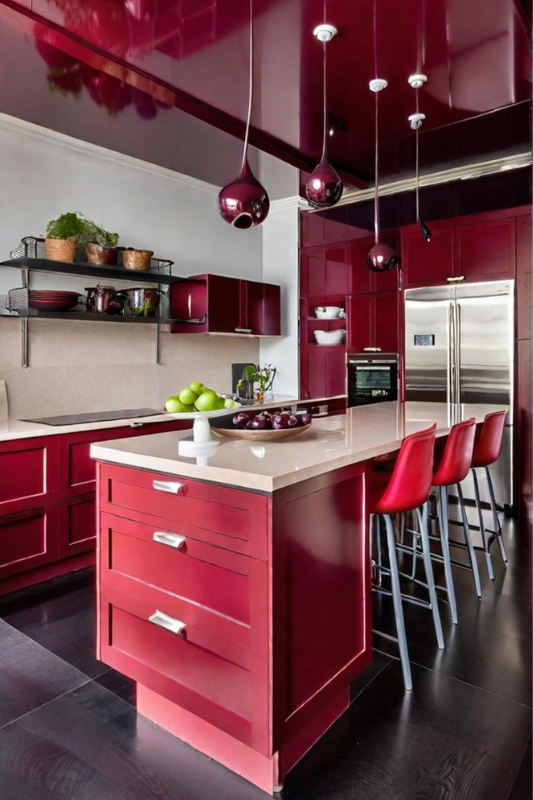 20. Vibrant Burgundy Kitchen with Glossy Finishes