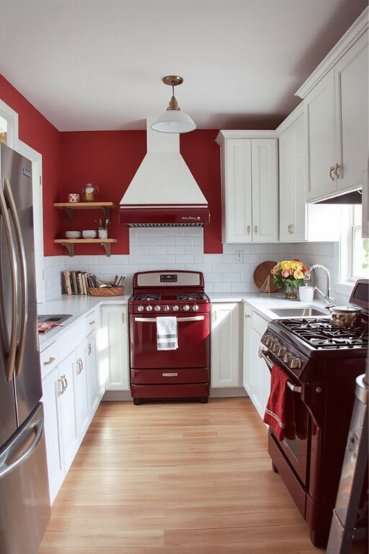 This color combination works beautifully for smaller kitchens. The white walls open up the space, while the burgundy appliances add a stylish focal point that feels cheerful and full of personality.