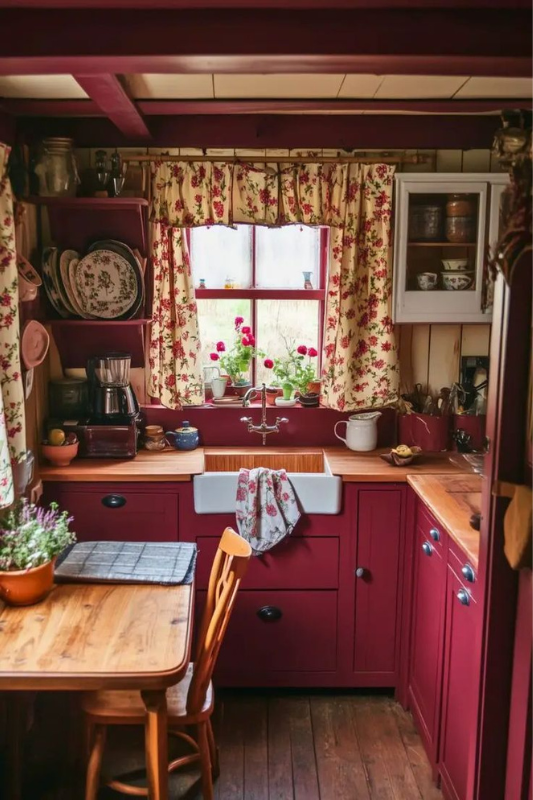 This cozy country cottage kitchen shows how burgundy can bring warmth to even the smallest spaces. The deep red cabinets and floral curtains create a cheerful, nostalgic feel, while the wooden countertops and farmhouse sink complete the look. Everything feels intentional yet relaxed, like a kitchen where stories are shared over fresh bread and tea.
