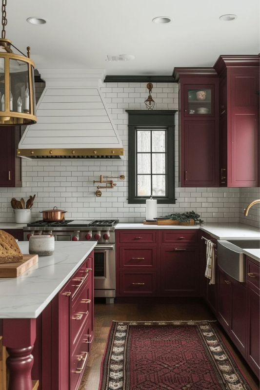Elegant, classic, and effortlessly polished, this burgundy kitchen brings modern grace to a timeless color. The crisp white subway tile backsplash creates a clean contrast, while the brass handles and light fixtures add a gentle golden glow. Every detail, from the shaker cabinets to the rich rug underfoot, feels carefully balanced.