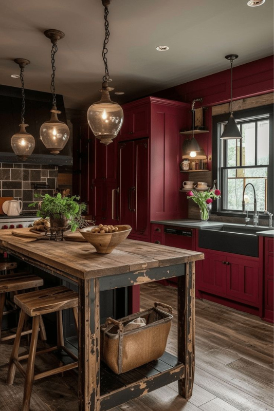 This moody farmhouse kitchen pairs deep burgundy cabinets with rustic materials for a space that feels grounded and soulful. The worn wooden island adds character, while the dark backsplash and lighting fixtures introduce a soft, dramatic edge. It’s the kind of kitchen that feels cozy on a rainy afternoon, filled with warmth and timeless charm.
