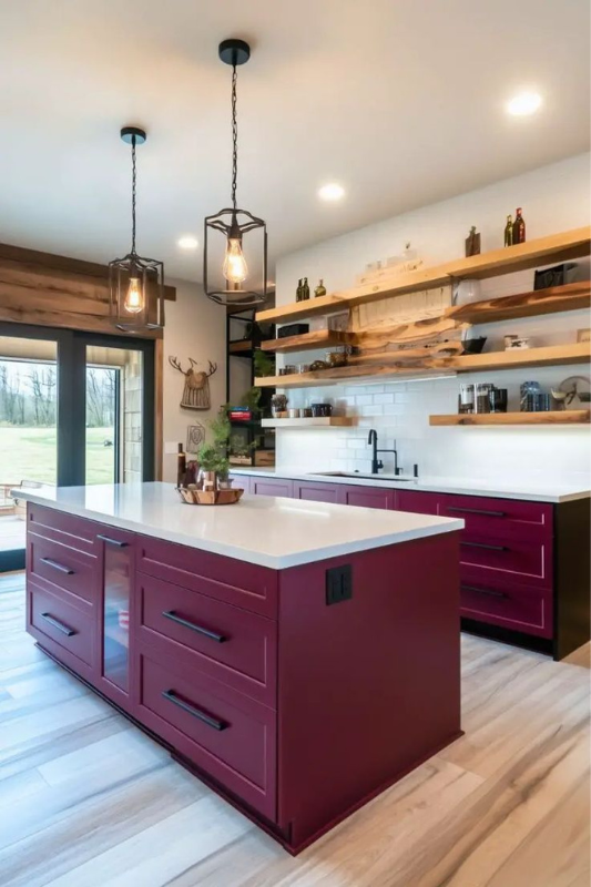 If you want a space that feels bold and artistic, this is the look to try. Pair burgundy cabinets with minimal décor and bright lighting to let the color take the spotlight. The result is a kitchen that feels alive and full of energy.