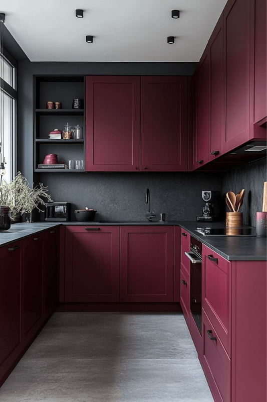 6. Minimalist Burgundy Kitchen with Deep Charcoal Contrast