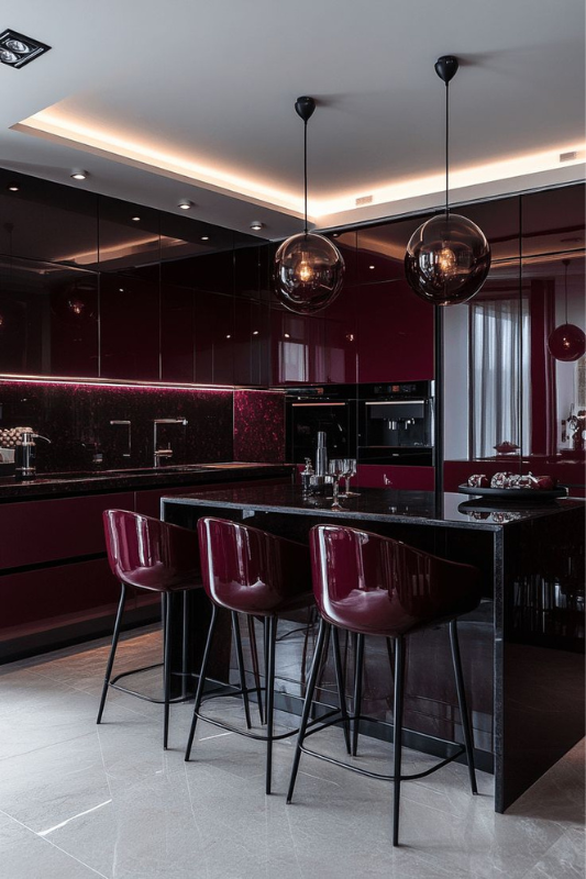 For those who enjoy a bold and contemporary look, a modern burgundy kitchen with glossy finishes brings instant drama. The smooth reflective cabinets amplify light, while the black countertops and sleek lighting create a striking visual contrast.