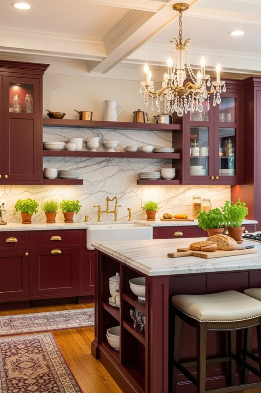 Few looks can rival the beauty of a burgundy and gold kitchen. Here, deep burgundy cabinets meet creamy marble surfaces and warm gold finishes, creating a space that radiates luxury. The open shelving keeps the look light, while the chandelier above the island adds sparkle and refinement.