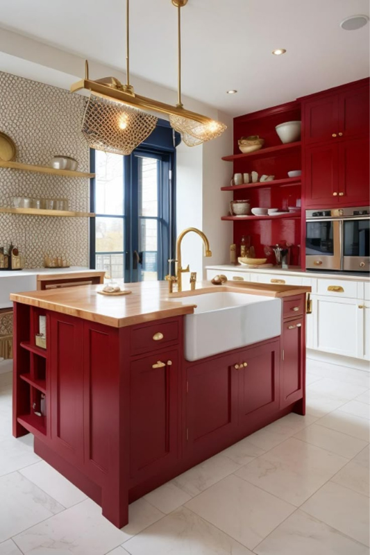 This burgundy and gold kitchen radiates refined luxury. The combination of deep red cabinets and warm brass hardware brings out the richness of the color, while the wooden countertop adds an inviting natural touch. The honey toned lighting and open shelves filled with neutral ceramics soften the boldness, giving the room a warm and elegant feel.