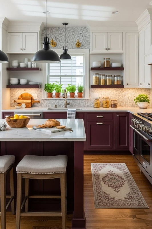 This color pairing works beautifully in both traditional and transitional kitchens. The contrast between the warm burgundy tones and the cool white walls gives the room a refined yet welcoming atmosphere.