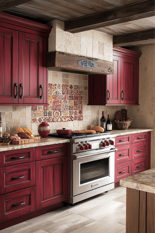 There is something timeless about a burgundy kitchen that features natural textures and deep character. In this design, rich burgundy cabinets with visible wood grain create a warm and welcoming look, while the rustic backsplash and exposed ceiling beams add charm and authenticity. The patterned tiles behind the stove bring an artisanal touch that feels both cozy and unique.